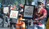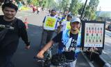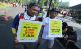 Sejumlah pesepeda membawa poster dalam rangka Hari Peringatan Sedunia untuk Korban Lalu Lintas Jalan atau Word Day of Remembrance For Road Traffic Victims (WDOR 2023), saat acara Car Free Day, Dago, Kota Bandung, Ahad (19/11/2023). Kegiatan tersebut digelar untuk mengenang jutaan orang yang menjadi korban kecelakaan lalu lintas dan sebabagi bentuk sosialisai pencegahan dan respons setelah kecelakaan. (FOTO : Edi Yusuf/Republika)