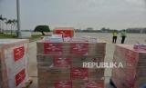 Deretan bantuan kemanusiaan untuk Palestina disimpan di area Pangkalan TNI AU Halim Perdanakusuma, Jakarta, Senin (20/11/2023). Pemerintah Indonesia bersama perusahaan dan donatur kembali mengirimkan bantuan kemanusiaan ke Palestina sebanyak 21 ton yang terdiri dari bantuan logistik, alat medis dan obat-obatan. (FOTO : Republika/Thoudy Badai)