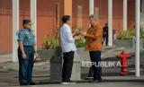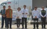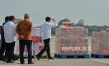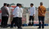 Presiden Joko Widodo bersama Dubes Palestina untuk Indonesia Zuhair S.M Al Shun (kedua kanan) Menko PMK Muhadjir Effendy (kedua kiri) dan Menkes Budi Gunadi Sadikin (kiri) meninjau bantuan sebelum pelepasan bantuan kemanusiaan untuk Palestina di Pangkalan TNI AU Halim Perdanakusuma, Jakarta, Senin (20/11/2023). Pemerintah Indonesia bersama perusahaan dan donatur kembali mengirimkan bantuan kemanusiaan ke Palestina sebanyak 21 ton yang terdiri dari bantuan logistik, alat medis dan obat-obatan. (FOTO : Republika/Thoudy Badai)