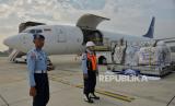 Petugas berjaga di area lokasi pelepasan bantuan kemanusiaan untuk Palestina di Pangkalan TNI AU Halim Perdanakusuma, Jakarta, Senin (20/11/2023). Pemerintah Indonesia bersama perusahaan dan donatur kembali mengirimkan bantuan kemanusiaan ke Palestina sebanyak 21 ton yang terdiri dari bantuan logistik, alat medis dan obat-obatan. (FOTO : Republika/Thoudy Badai)