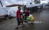 Seorang pria membawa putrinya dengan gerobak dorong melewati jalan-jalan kamp pengungsian PBB yang banjir setelah hujan turun di kota selatan Khan Younis, Jalur Gaza, Ahad, (19/11/2023). (FOTO : AP Photo/Fatima Shbair)
