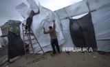 Warga Palestina yang mengungsi akibat pemboman Israel di Jalur Gaza membangun tenda di bawah hujan di kamp tenda PBB di Khan Younis, Ahad, (19/11/2023). (FOTO : AP Photo/Fatima Shbair)