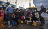 Warga Palestina yang mengungsi akibat pemboman Israel di Jalur Gaza mengantri untuk mendapatkan air di kamp pengungsian PBB di kota selatan Khan Younis, Jalur Gaza, Ahad, (19/11/2023). (FOTO : AP Photo/Fatima Shbair)