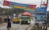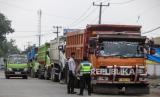 Polisi dan Petugas Dishub mencegat truk yang akan melintas di Jalan Sudamanik, Parung Panjang, Kabupaten Bogor, Jawa Barat, Senin (20/11/2023). Kondisi jalan yang rusak serta berlubang dan keberadaan truk muatan tambang yang beroperasi pada jam yang belum ditentukan tersebut dapat membahayakan keselamatan pengendara lain. (FOTO : Republika/Putra M. Akbar)