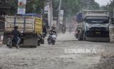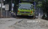 Truk melewati jalan yang rusak di Jalan Sudamanik, Parung Panjang, Kabupaten Bogor, Jawa Barat, Senin (20/11/2023). Kondisi jalan yang rusak serta berlubang dan keberadaan truk muatan tambang yang beroperasi pada jam yang belum ditentukan tersebut dapat membahayakan keselamatan pengendara lain. (FOTO : Republika/Putra M. Akbar)