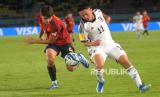 Duel gelandang Timnas U17 Spanyol, Pau Cubarsi dengan penyerang Timnas U17 Jepang Rento Takaoka pada pertandingan babak 16 besar Piala Dunia U17 2023 di Stadion Manahan, Surakarta, Jawa Tengah, Senin (20/11/2023). Pada pertandingan ini Spanyol berhasil mengalahkan Jepang dengan skor 2-1. (FOTO : Republika/Wihdan Hidayat)