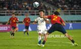 Penyerang Timnas U17 Spanyol, Marc Guiu mencoba melewati bek tengah Timnas U17 Jepang Kotaro Honda pada pertandingan babak 16 besar Piala Dunia U17 2023 di Stadion Manahan, Surakarta, Jawa Tengah, Senin (20/11/2023). Pada pertandingan ini Spanyol berhasil mengalahkan Jepang dengan skor 2-1. (FOTO : Republika/Wihdan Hidayat)