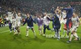Para pemain Italia merayakan kualifikasi mereka setelah pertandingan sepak bola kualifikasi grup C Euro 2024 antara Ukraina dan Italia di BayArena di Leverkusen, Jerman, Selasa (21/11) dini hari WIB. (FOTO : AP Photo/Martin Meissner)