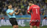 Wasit Jesus Gil Manzano dari Spanyol berbicara dengan kiper Italia Gianluigi Donnarumma selama pertandingan sepak bola kualifikasi grup C Euro 2024 antara Ukraina dan Italia di BayArena di Leverkusen, Jerman, Selasa (21/11) dini hari WIB. (FOTO : AP Photo/Martin Meissner)