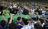 Lionel Messi Dkk ikut menghampiri kericuhan itu mendekati tribun penonton bagian belakang untuk menenangkan kedua suporter.
