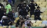 Anggota polisi Brasil mencoba mengendalikan bentrokan antar penggemar sebelum pertandingan sepak bola kualifikasi Piala Dunia FIFA 2026 antara Brasil dan Argentina di stadion Maracana di Rio de Janeiro, Brasil, Rabu (22/11/2023) WIB. (FOTO : EPA-EFE/Antonio Lacerda)