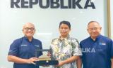 Ari Respati Direktur Utama ITDC, Pemimpin Redaksi Republika Elba Damhuri, Direktur Operasional ITDC Troy reza waroka (dari kiri) foto bersama dan memberikan cinderamata saat kunjungan ke kantor Redaksi Republika, Jakarta, Rabu (22/11/23). Kunjungan dalam rangka memperkenalkan Mandalika menjadi destinasi Utama sport tourism. Ahmad Fauji/Republika (FOTO : Republika/Ahmad fauji)