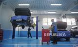 Teknisi sedang melakukan pengecekan unit mobil di Plaza Subaru Tebet, Jakarta, Kamis (23/11/2023). (FOTO : Republika/ Tahta Aidilla)