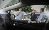 Chief Executive Officer Subaru IndonesiaArie Christopher, Board of Director Plaza Capital Group Paula Dewiyanti, General Manager Operation Plaza Subaru Ricky Aliwarga (dari kiri) berbincang saat peresmian Plaza Subaru Tebet, Jakarta, Kamis (23/11/2023). (FOTO : Republika/ Tahta Aidilla)