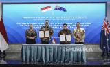 REPUBLIKA.CO.ID,JAKARTA -- Menteri Koordinator Bidang Kemaritiman dan Investasi (Menko Marves) Ad Interim Erick Thohir (kanan) dan Menteri Industri dan Ilmu Pengetahuan Australia Ed Husic (kedua kiri) menyampaikan keterangan pers usai melakukan penandatanganan nota kesepahaman tentang pembentukan mekanisme bilateral untuk memajukan kolaborasi kendaraan listrik antara Indonesia dengan Australia di Jakarta, Kamis (23/11/2023).