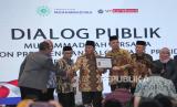 Calon Presiden nomor urut 2 Prabowo Subianto (keempat kiri) menerima Tanda Kehormatan Anggota Muhammadiyah secara simbolis dari Ketua PP Muhammadiyah Irwan Akib (ketiga kanan) usai Dialog Publik di Universitas Muhammadiyah (UM) Surabaya, Jawa Timur, Jumat (24/11/2023). Dialog publik tersebut bertujuan untuk menguji pengetahuan, wawasan serta gagasan calon presiden dan calon wakil presiden sehingga pada Pemilu 2024 masyarakat menjadi warga yang cerdas dalam memilih pemimpin.  (FOTO : ANTARA FOTO/Moch Asim)