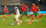 Penyerang Timnas U17 Mali Ibrahim Kanate lepas dari kawalan dua pemain Timnas U17 Maroko pada pertandingan Perempatfinal Piala Dunia U17 2023 di Stadion Manahan, Surakarta, Jawa Tengah, Sabtu (25/11/2023). Mali memastikan melaju ke babak Semifinal usai mengalahkan Maroko dengan skor tipis 1-0. Gol tunggal Mali dicetak oleh kapten tim Ibrahim Diarra. (FOTO : Republika/Wihdan Hidayat)