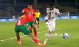 Bek Timnas U17 Maroko, Chlagmo berhasil membuang bola dari penyerang Timnas U17 Mali Barry pada pertandingan Perempat Final Piala Dunia U17 2023 di Stadion Manahan, Surakarta, Jawa Tengah, Sabtu (25/11/2023). Pada babak pertama Mali bermain imbang dengan Maroko dengan skor 0-0. (FOTO : Republika/Wihdan Hidayat)