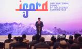 Presiden Joko Widodo menyampaikan sambutan sekaligus membuka R20 International Summit of Religious Authorities (ISORA) di Jakarta, Senin (27/11/2023). Dalam pertemuan pengampu keagamaan internasional tersebut membahas peran agama dalam mengatasi konflik di Timur Tengah dan ancaman terhadap tatanan internasional khususnya mengenai tragedi kemanusiaan di Gaza, Palestina. (FOTO : Republika/Thoudy Badai)