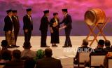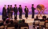 Presiden Joko Widodo (kanan) didampingi Menteri Luar Negeri Retno Marsudi (kedua kanan), Menteri Agama Yaqut Cholil Qoumas (ketiga kiri), Ketua Umum PBNU Yahya Cholil Staquf (ketiga kanan), Director of the World Muslim League Abdurrahman Mohammad Amin al-Khayyat (kiri), Katib Aam PBNU Ahmad Said Asrori (kedua kiri), dan Penjabat (Pj) Gubernur DKI Jakarta Heru Budi Hartono (tengah) secara simbolik memukul bedug saat membuka R20 International Summit of Religious Authorities (ISORA) di Jakarta, Senin (27/11/2023). Dalam pertemuan pengampu keagamaan internasional tersebut membahas peran agama dalam mengatasi konflik di Timur Tengah dan ancaman terhadap tatanan internasional khususnya mengenai tragedi kemanusiaan di Gaza, Palestina. (FOTO : Republika/Thoudy Badai)