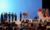 REPUBLIKA.CO.ID, JAKARTA -- Presiden Joko Widodo didampingi Menteri Luar Negeri Retno Marsudi (kedua kanan), Menteri Agama Yaqut Cholil Qoumas, Ketua Umum PBNU Yahya Cholil Staquf, Director of the World Muslim League Abdurrahman Mohammad Amin al-Khayyat secara simbolik memukul bedug saat membuka R20 International Summit of Religious Authorities (ISORA) di Jakarta, Senin (27/11/2023).