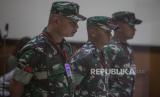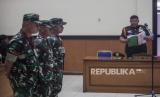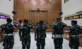 Terdakwa kasus pembunuhan terhadap Imam Masykur, Praka Riswandi Manik (kedua kanan), Praka Heri Sandi (tengah) dan Praka Jasmowir (kedua kiri) melakukan penghormatan saat menjalani sidang tuntutan di Pengadilan Militer II-08, Jakarta, Senin (27/11/2023). Tiga terdakwa yang merupakan anggota TNI Angkatan Darat tersebut dituntut hukuman mati dan dipecat dari Dinas Militer TNI Angkatan Darat, karena terbukti telah melakukan penganiayaan, penculikan dan pembunuhan berencana terhadap Imam Masykur. (FOTO : Republika/Putra M. Akbar)