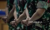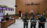 REPUBLIKA.CO.ID,JAKARTA -- Terdakwa kasus pembunuhan terhadap Imam Masykur, Praka Riswandi Manik, Praka Heri Sandi, dan Praka Jasmowir (dari kiri ke kanan) saat menjalani sidang tuntutan di Pengadilan Militer II-08, Jakarta, Senin (27/11/2023).