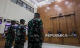 Terdakwa kasus pembunuhan terhadap Imam Masykur, Praka Riswandi Manik, Praka Heri Sandi dan Praka Jasmowir (dari kiri ke kanan) saat menjalani sidang tuntutan di Pengadilan Militer II-08, Jakarta, Senin (27/11/2023). Tiga terdakwa yang merupakan anggota TNI Angkatan Darat tersebut dituntut hukuman mati dan dipecat dari Dinas Militer TNI Angkatan Darat, karena terbukti telah melakukan penganiayaan, penculikan dan pembunuhan berencana terhadap Imam Masykur. (FOTO : Republika/Putra M. Akbar)