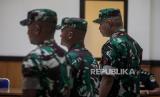 Terdakwa kasus pembunuhan terhadap Imam Masykur, Praka Riswandi Manik, Praka Heri Sandi dan Praka Jasmowir (dari kanan ke kiri) mengambil sikap istirahat saat menjalani sidang tuntutan di Pengadilan Militer II-08, Jakarta, Senin (27/11/2023). Tiga terdakwa yang merupakan anggota TNI Angkatan Darat tersebut dituntut hukuman mati dan dipecat dari Dinas Militer TNI Angkatan Darat, karena terbukti telah melakukan penganiayaan, penculikan dan pembunuhan berencana terhadap Imam Masykur. (FOTO : Republika/Putra M. Akbar)