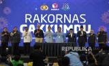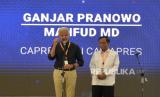Pasangan Capres-Cawapres Nomor Urut 3 Ganjar Pranowo-Mahfud MD menyampaikan komitmennya saat acara Rakornas Gakkumdu di Jakarta, Senin (27/11/2023). Rakornas Gakkumdu ini dalam rangka meningkatkan soliditas sekaligus menyamakan pemahaman persepsi dalam sebuah penegakan hukum pemilu dalam mewujudkan keadilan pemilu. Rakornas ini mengangkat tema Gakkumdu Mengawal Pemilu 2024 yang Demokratis dan Bersahabat. (FOTO : Republika/Prayogi)