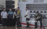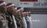 Pj Gubernur Jawa Barat Bey Triadi Machmudin (ketiga kiri) beserta jajaran menghadiri Deklarasi Damai Relawan Capres Cawapres Pemilu 2024 di GOR Saparua, Bandung, Jawa Barat, Senin (27/11/2023). Deklarasi yang diinisiasi oleh Komite Intelijen Daerah (KOMIDA) tersebut mengusung tema Jabar Akur (Aman, Kondusif dan Rukun), serta dihadiri oleh relawan dari tiga pasangan capres-cawapres. Deklarasi tersebut bertujuan untuk menjalin kesepahaman dalam menjaga dan menciptakan kondisi daerah tetap aman, serta kondusif selama pelaksanaan hingga berakhirnya masa Pemilu 2024. (FOTO : REPUBLIKA/ABDAN SYAKURA)