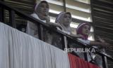 Peserta menghadiri Deklarasi Damai Relawan Capres Cawapres Pemilu 2024 di GOR Saparua, Bandung, Jawa Barat, Senin (27/11/2023). Deklarasi yang diinisiasi oleh Komite Intelijen Daerah (KOMIDA) tersebut mengusung tema Jabar Akur (Aman, Kondusif dan Rukun), serta dihadiri oleh relawan dari tiga pasangan capres-cawapres. Deklarasi tersebut bertujuan untuk menjalin kesepahaman dalam menjaga dan menciptakan kondisi daerah tetap aman, serta kondusif selama pelaksanaan hingga berakhirnya masa Pemilu 2024. (FOTO : REPUBLIKA/ABDAN SYAKURA)