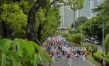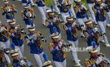 Grup marching band beserta petugas Komisi Pemilihan Umum (KPU) menggelar defile kirab bendera peserta Pemilu 2024 dari Jalan imam Bonjol menuju gedung KPU, Jakarta, Senin (27/11/2023). Kirab 18 bendera parpol peserta Pemilu 2024 tersebut dilakukan dalam rangkaian acara Deklarasi Kampanye Pemilu Damai sebagai upaya mensosialisasikan partai politik peserta Pemilu 2024 yang akan digelar pada 14 Februari 2024 mendatang. Selain itu kirab tersebut mendapatkan rekor Muri karena merupakan kirab bendera peserta pemilu secara estafet melalui daerah terbanyak. (FOTO : Republika/Thoudy Badai)