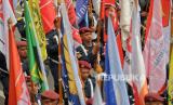 Petugas Komisi Pemilihan Umum (KPU) beserta tim marching band menggelar defile kirab bendera peserta Pemilu 2024 dari Jalan imam Bonjol menuju gedung KPU, Jakarta, Senin (27/11/2023). Kirab 18 bendera parpol peserta Pemilu 2024 tersebut dilakukan dalam rangkaian acara Deklarasi Kampanye Pemilu Damai sebagai upaya mensosialisasikan partai politik peserta Pemilu 2024 yang akan digelar pada 14 Februari 2024 mendatang. Selain itu kirab tersebut mendapatkan rekor Muri karena merupakan kirab bendera peserta pemilu secara estafet melalui daerah terbanyak. (FOTO : Republika/Thoudy Badai)