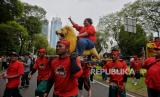Relawan menaiki sisingaan saat menghadiri acara Deklarasi Kampanye Pemilu Damai di deoan kantor KPU, Jakarta, Senin (27/11/2023). Kirab 18 bendera parpol peserta Pemilu 2024 tersebut dilakukan dalam rangkaian acara Deklarasi Kampanye Pemilu Damai sebagai upaya mensosialisasikan partai politik peserta Pemilu 2024 yang akan digelar pada 14 Februari 2024 mendatang. Selain itu kirab tersebut mendapatkan rekor Muri karena merupakan kirab bendera peserta pemilu secara estafet melalui daerah terbanyak. (FOTO : Republika/Thoudy Badai)