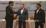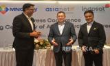 REPUBLIKA.CO.ID, JAKARTA -- President Director & CEO Indosat Ooredoo Hutchison (IOH) Vikram Sinha, Executive Chairman MNC Group Hary Tanoesoedibjo, dan CEO & Managing Director Lightstorm Group Amajit Gupta berfoto seusai konferensi pers di Jakarta, Senin (27/11/2023).