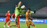 Penjaga gawang Persija Jakarta Andritany Ardhiyasa (kiri) menangkap bola yang akan disundul pesepak bola Bhayangkara Presisi Indonesia Fc Sani Rizki (kanan) pada lanjutan Liga 1`di Stadion Patriot Chandrabhaga, Senin (27/11/2023). Bhayangkara Fc. (FOTO : ANTARA FOTO/Fakhri Hermansyah)