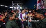 Calon Presiden Anies Baswedan saat akan memakai selendang disela menyampaikan pidato politik di kawasan Tanah Merah, Jakarta, Selasa (28/11/2023). Anies Baswedan melakukan kampanye Pilpres 2024 pertamanya dengan mengunjungi dan menyapa warga Tanah Merah untuk meraih suara masyarakat. (FOTO : Republika/Putra M. Akbar)