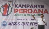 Capres Anies Baswedan menyampaikan pidato politik di kawasan Tanah Merah, Jakarta.