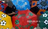 Pengerajin melukis payung dengan tema Piala Dunia U17 di Nasrafa, Surakarta, Jawa Tengah, Selasa (28/11/2023). Untuk memeriahkan Piala Dunia U17 pengerajin melukis payung sepak bola. Namun, pengerajin tidak berani melukis dengan logo piala dunia karena tidak memiliki lisensi FIFA. Setiap payung dijual dengan harga Rp 125 ribu hingga Rp 200 ribu tergantung ukuran dan motifnya. (FOTO : Republika/Wihdan Hidayat)