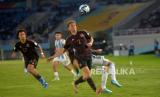 Gelandang Timnas U17 Jerman, Kurt Rueger berhasil mengalau bola dari pemain Timnas U17 Argentina pada pertandingan Semifinal Piala Dunia U17 2023 di Stadion Manahan, Surakarta, Jawa Tengah, Selasa (28/11/2023). Jerman bersusah payah mengalahkan Argentina melalui babak adu pinalti 4-2, usai bermain imbang 3-3. Jerman memastikan melaju ke babak final yang diadakan pada Sabtu (3/12/2023) mendatang. (FOTO : Republika/Wihdan Hidayat)