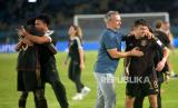 Pelatih Timnas U17 Jerman, Christian Wueck memberikan selamat kepada pemain usai menang adu pinalti dengan Timnas U17 Argentina pada pertandingan Semifinal Piala Dunia U17 2023 di Stadion Manahan, Surakarta, Jawa Tengah, Selasa (28/11/2023). Jerman bersusah payah mengalahkan Argentina melalui babak adu pinalti 4-2, usai bermain imbang 3-3. Jerman memastikan melaju ke babak final yang diadakan pada Sabtu (3/12/2023) mendatang. (FOTO : Republika/Wihdan Hidayat)