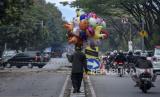 Pedagang balon berjalan di dekat proyek perbaikan cross drain (saluran drainase bawah tanah) di kawasan Gedebage, Bandung, Jawa Barat, Rabu (29/11/2023). Kementerian PUPR bersama Pemerintah Provinsi Jawa Barat melakukan berbagai langkah untuk mengantisipasi banjir di Kota Bandung dalam memasuki musim hujan. Diantaranya, melakukan perbaikan cross drain di kawasan Gedebage yang sering terjadi banjir. (FOTO : REPUBLIKA/ABDAN SYAKURA)
