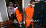 Tersanngka dihadirkan saat pengungkapan tindak pidana perdagangan orang (TPPO) di Polresta Yogyakarta, Rabu (29/11/2023). Sebanyak empat tersangka kasus TPPO diamankan Polresta Yogyakarta karena eksploitasi secara seksual terhadap anak. Kedua korban yang diamankan berasal dari DKI Jakarta dan dibawah umur, KR (15) dan MC (14) menjadi pekerja seks komersial melalui aplikasi dan tidak diberikan gaji oleh tersangka. Akibat perbuatannya tersangka diancam Pasal 88 Jo 761 UU No.35/ 2014 dengan ancaman penjara maksimal 10 tahun dan denda paling banyak Rp 200 juta. (FOTO : Republika/Wihdan Hidayat)