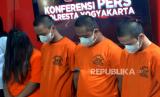 REPUBLIKA.CO.ID, YOGYAKARTA -- Empat tersangka tindak pidana perdagangan orang (TPPO) dihadirkan saat rilis di Polresta Yogyakarta, Rabu (29/11/2023).
