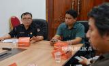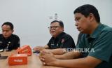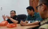 Pemimpin Redaksi Republika, Elba Damhuri (kanan) berbincang bersama Kepala Bagian Hubungan Antar Lembaga Komisi Pemilihan Umum (KPU), Dohardo Pakpahan (tengah) saat berkunjung ke kantor KPU, Jakarta, Rabu (29/11/2023). Kunjungan tersebut membahas tentang peran media dan KPU dalam mengedukasi masyarakat menghadapi Pemilu 2024 mendatang. (FOTO : Republika/Thoudy Badai)