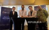 President Director Cosmax Indonesia Cheong Min-Kyoung, CEO & Founder Hypefast Achmad Alkatiri, CEO Lazada Indonesia James Chang dan Direktur Aplikasi Permainan, Televisi & Radio Kemenparekraf Iman Santosa (dari kiri) berbincang usai Press Conference Road to Indonesia Brand Forum Summit 2024 di Jakarta, Rabu (29/11/2023). Hypefast perusahaan ritel berbasis teknologi yang menaungi sejumlah brand lokal ternama menggandeng Lazada Indonesia dan Cosmax dalam kolaborasi untuk memperkuat kerja sama jangka panjang dalam mendorong pertumbuhan brand lokal di tanah air. Pada Januari 2024 mendatang Hypefast akan menggelar Indonesia Brand Forum Summit (IBFS) 2024 sebagai bagian dari tanggung jawab sosial dan kontribusi Hypefast dalam kemajuan industri brand lokal di tanah air secara keseluruhan. (FOTO : Republika/Prayogi)