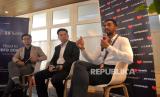 CEO & Founder Hypefast Achmad Alkatiri (kanan), CEO Lazada Indonesia James Chang (tengah) dan President Director Cosmax Indonesia Cheong Min-Kyoung (kiri) saat Press Conference Road to Indonesia Brand Forum Summit 2024 di Jakarta, Rabu (29/11/2023). Hypefast perusahaan ritel berbasis teknologi yang menaungi sejumlah brand lokal ternama menggandeng Lazada Indonesia dan Cosmax dalam kolaborasi untuk memperkuat kerja sama jangka panjang dalam mendorong pertumbuhan brand lokal di tanah air. Pada Januari 2024 mendatang Hypefast akan menggelar Indonesia Brand Forum Summit (IBFS) 2024 sebagai bagian dari tanggung jawab sosial dan kontribusi Hypefast dalam kemajuan industri brand lokal di tanah air secara keseluruhan. (FOTO : Republika/Prayogi)
