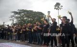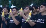 Mahasiswa mengikuti mimbar rakyat Tahta Untuk Rakyat di Monumen Serangan Umum 1 Maret, Yogyakarta, Rabu (29/11/2023). Pada aksinya mahasiswa membawa jagung sebagai bentuk umur demokrasi di Indonesia yang hanya sebentar atau seumur jagung. (FOTO : Republika/Wihdan Hidayat)