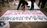 Mahasiswa mengecat spanduk untuk mimbar rakyat Tahta Untuk Rakyat di Monumen Serangan Umum 1 Maret, Yogyakarta, Rabu (29/11/2023).  Pada aksinya mahasiswa membawa jagung sebagai bentuk umur demokrasi di Indonesia yang hanya sebentar atau seumur jagung. (FOTO : Republika/Wihdan Hidayat)
